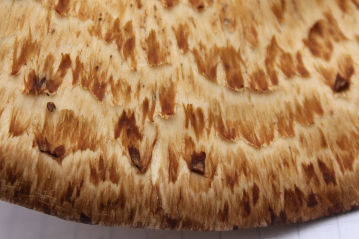 Hutoberfläche Schuppiger Porling: Größere, flache, faserige Fetzen liegen auf dem Hut auf; sie sind meist wesentlich dunkler als der Rest. Der Hutrand ist jung lange eingerollt und glatt: