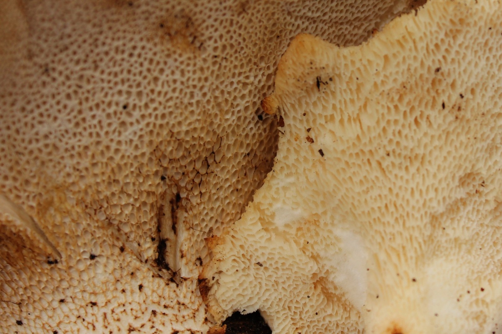Poren: weißlich, im Alter cremefarben bis blassocker; bei Verletzungen gelegentlich schwach bräunend; Poren rundlich bis eckig, selten etwas langgezogen; Röhren kurz, weich, teils etwas schwammig oder fast gelatinös wirkend; am Stiel herablaufend