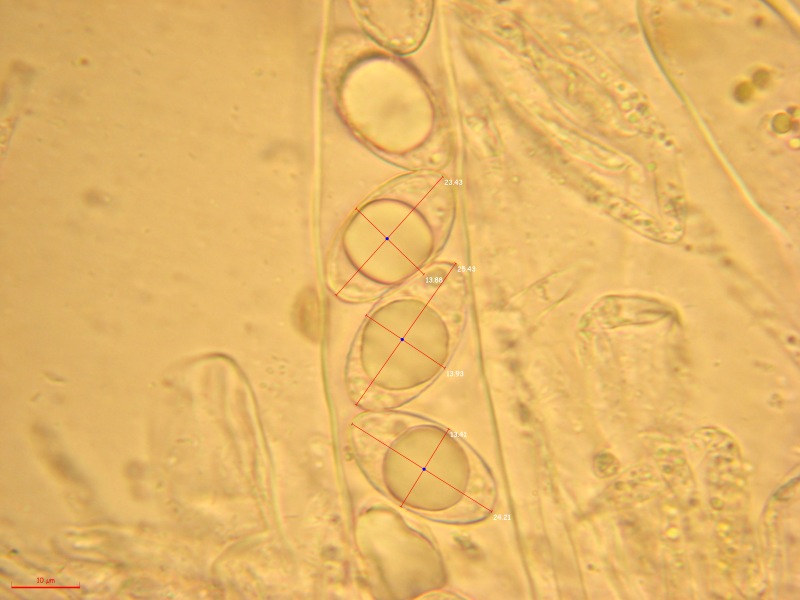 Mir fällt gerade ein, ich hatte die Fruchtkörper mitgenommen. Die sind zwar arg vertrocknet, aber Sporen müssten zu finden sein. Ich poste morgen mal ein paar Bilder.