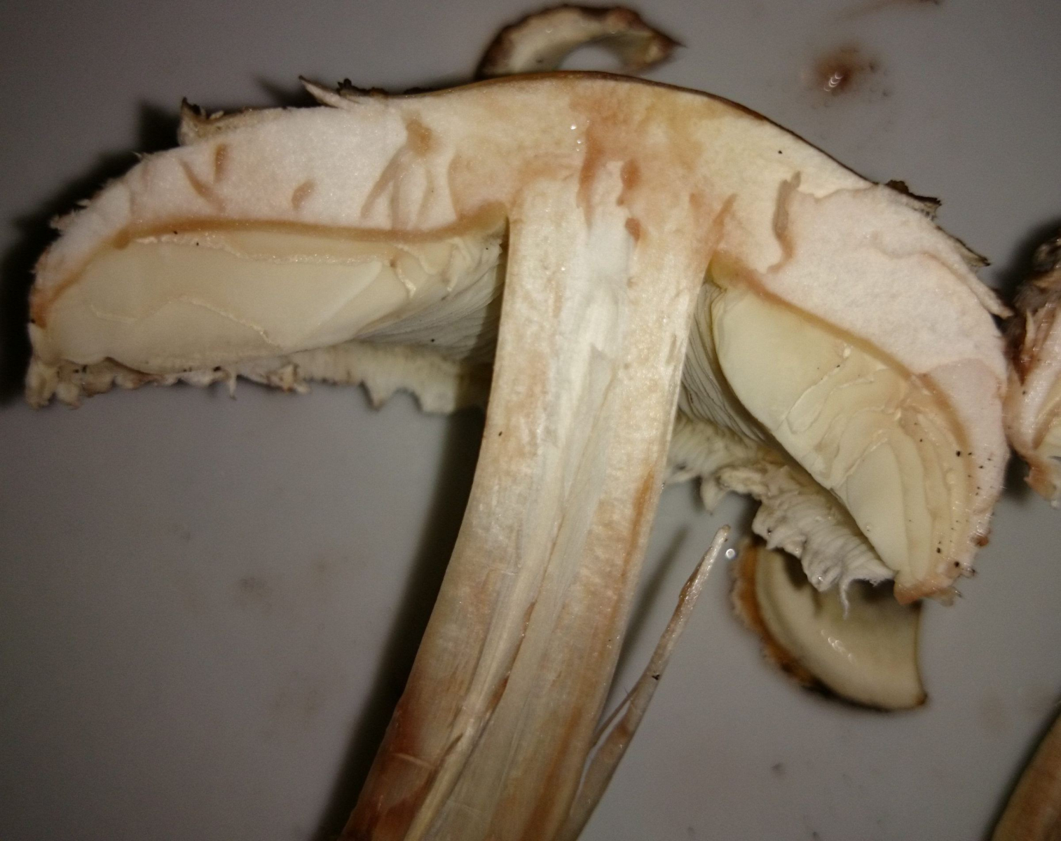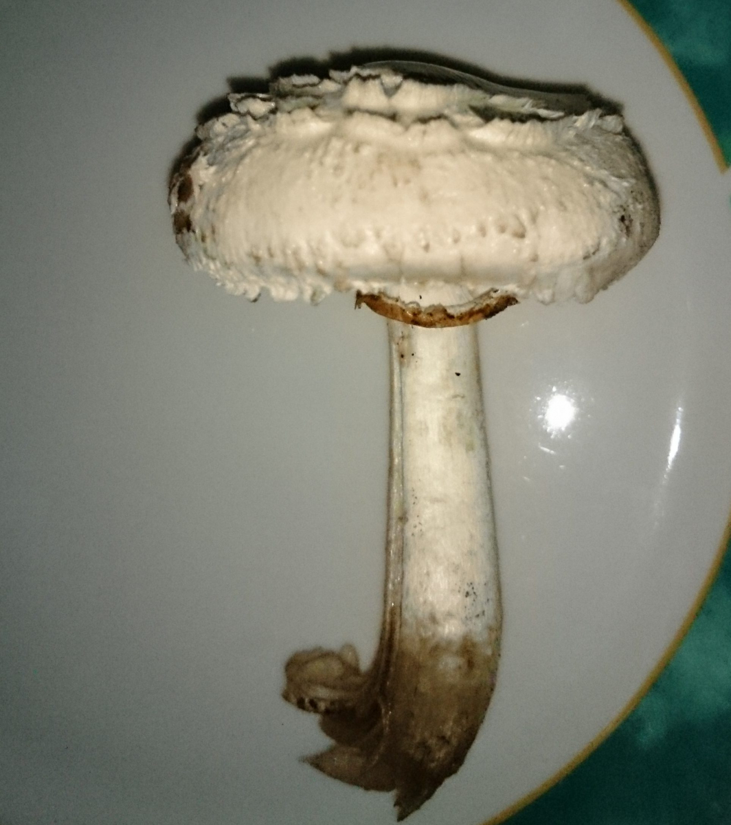 der kleine pilz hat ne baune oberfläche, der pilz ist kürzlich aus der erde gekommen und fängt schnell an zu verkorken bzw an der oberfläche weis zu werden so als würd er schuppen haben und das braune geht weg..