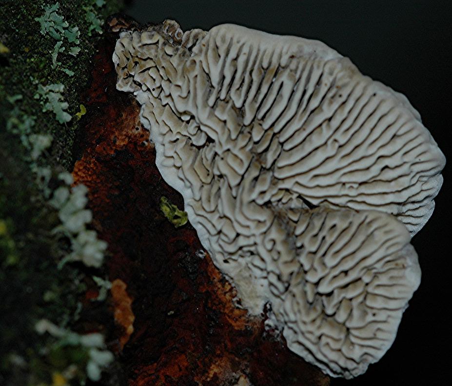 Hallo - das ist die lamellige Form der Rötenden Tramete. Findet man meist an Kirschbaumholz.