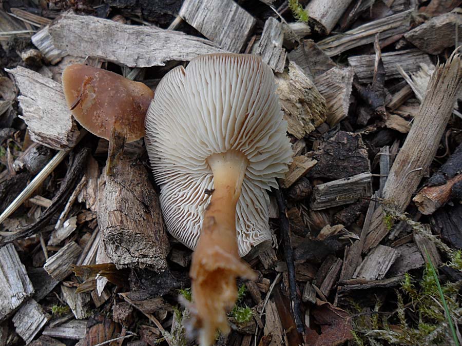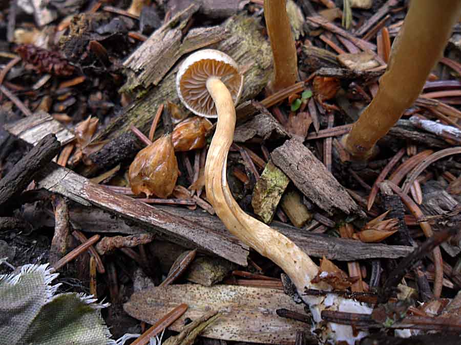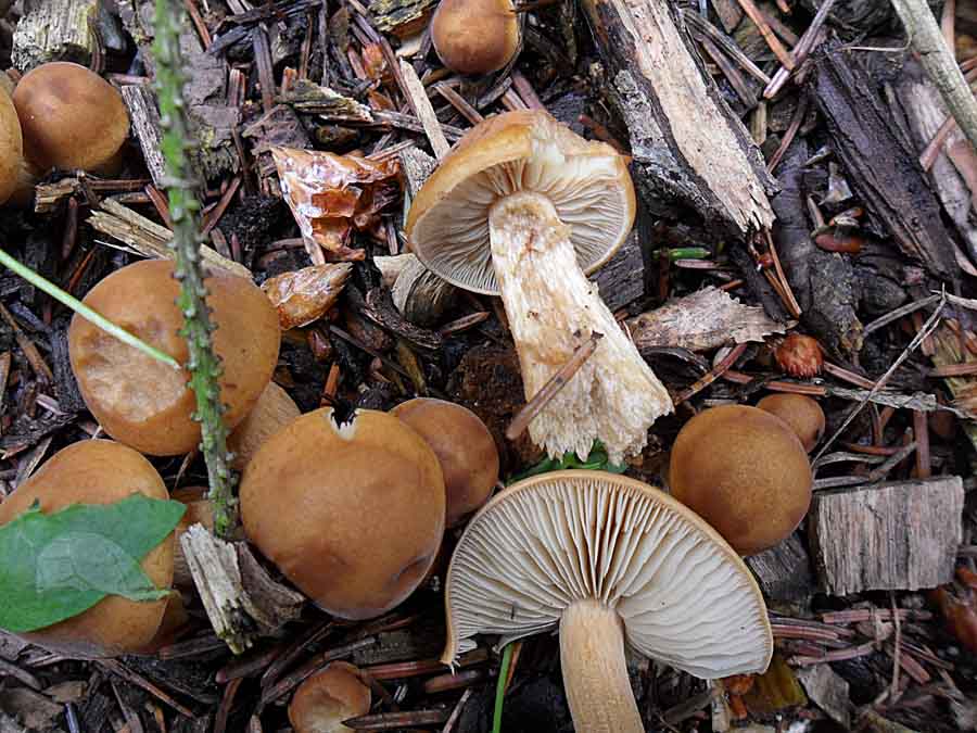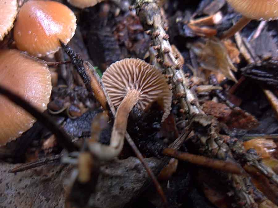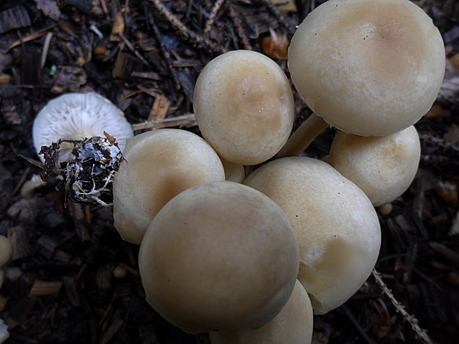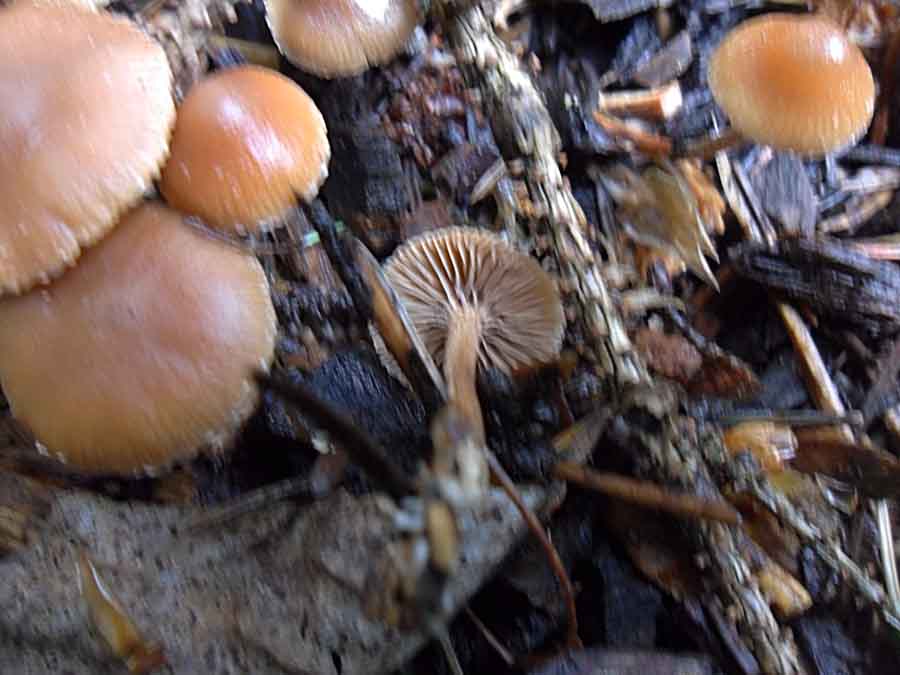 Nr.3 und 4: Agrocybe pediades paßt auch ganz gut aber ich habe da meine Zweifel weil ich nirgends von einem Vorkommen auf Rindemulch gelesen habe. Eine schmierige Huthaut hat nach 36 Stunden Dauerregen ja fast jeder Pilz.