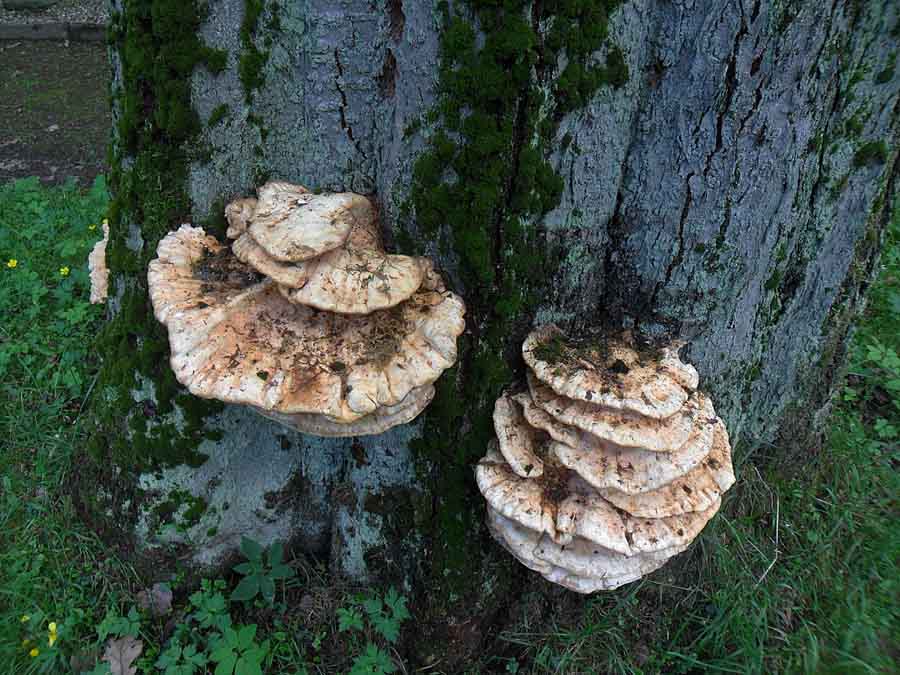 Wenn du nächstes Frühjahr mal in Auwäldern nach Morcheln suchst, dann schau bei alten Weiden und Pappeln als mal nach oben. Dann siehst du sicher auch diese Schwefelporlings - Ruinen aus dem Vorjahr. Die sind meist reinweiß, oder ein wenig grau gefleckt. Bröckelig und leicht.