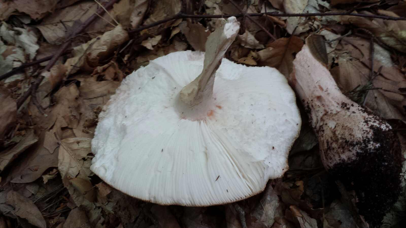 Reste der Gesamthülle als Flocken auf dem Hut. Stiel läuft keulig aus. Manschette nicht (mehr) vorhanden. Keine deutliche Farbveränderung auf Druck eher ein dunkeln das ich auf das Alter des Pilzes schiebe.