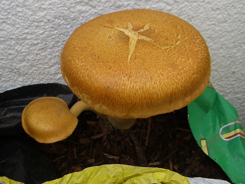 gestern habe ich im angebrochenen, zusammen geklappten Rindenmulch-Sack einen großen Pilz gefunden und würde gerne wissen, was es für einer sein könnte.