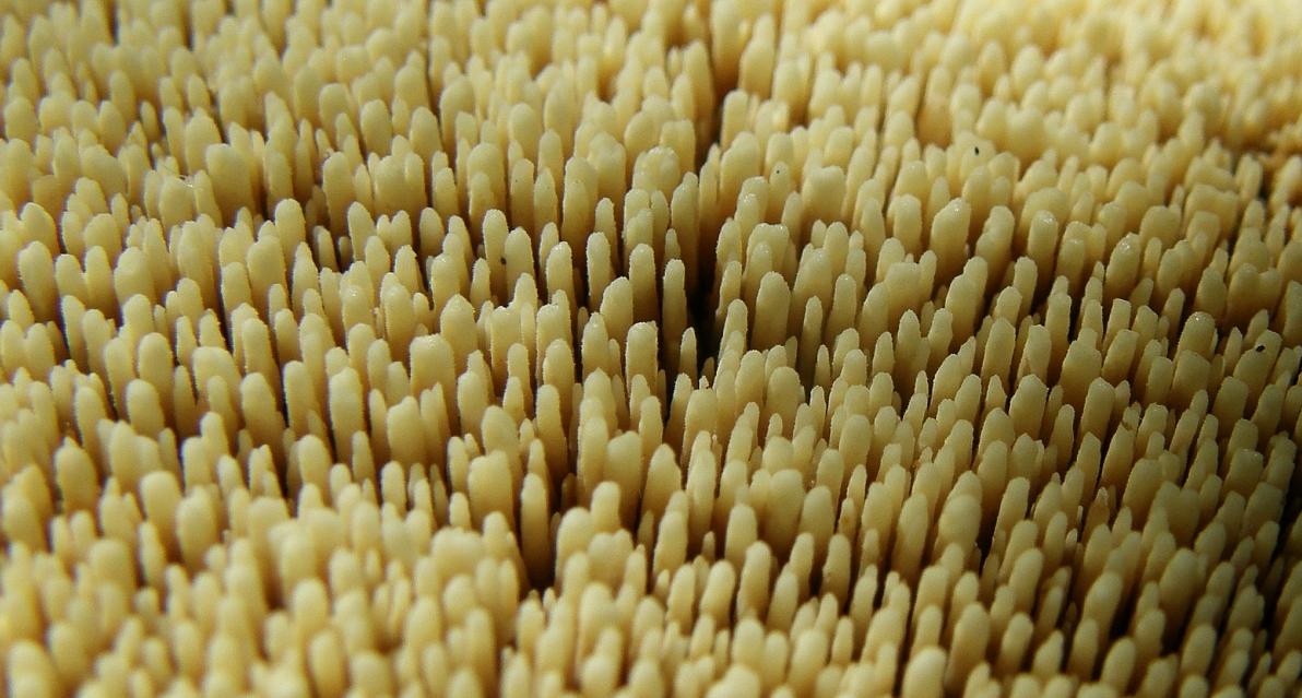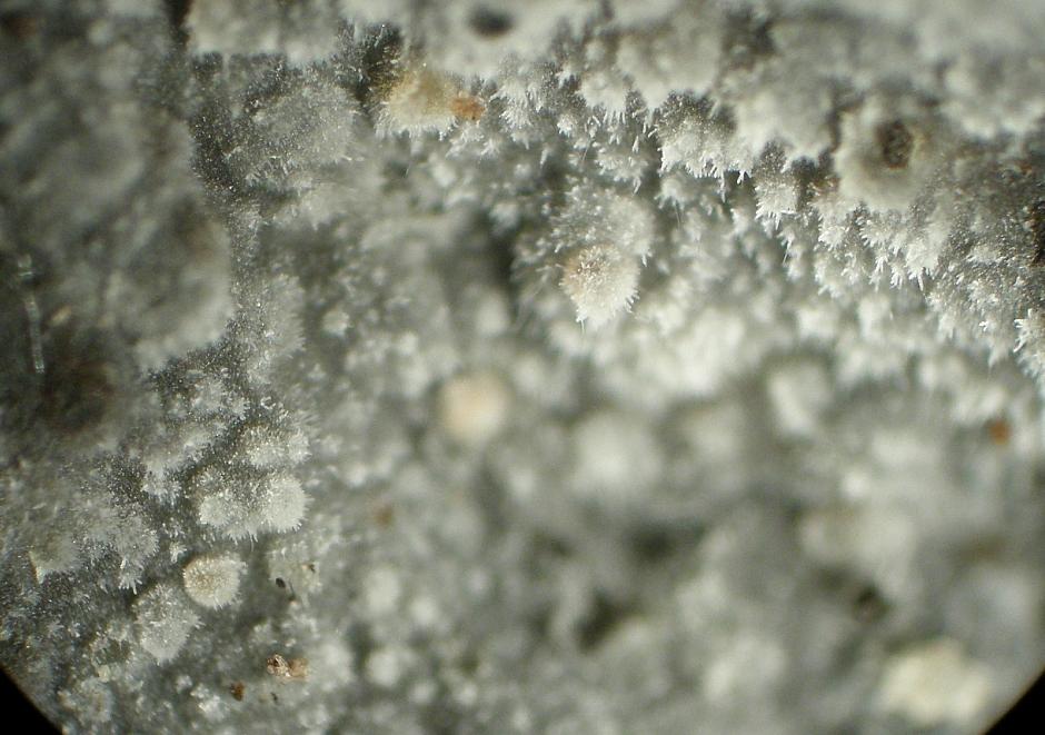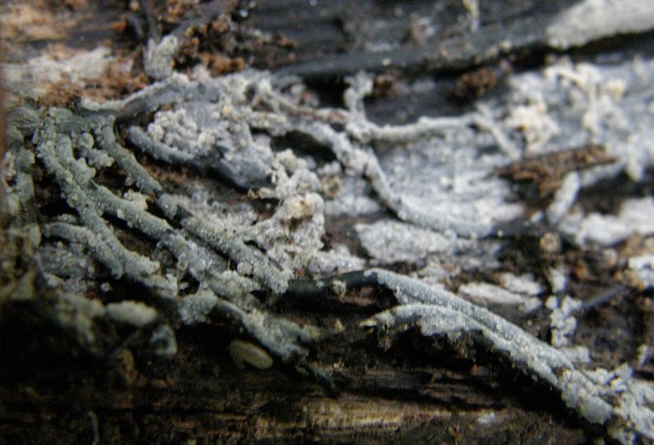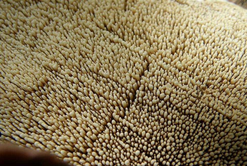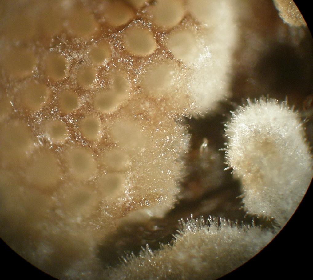 An liegenden Rotbuchenstämmen, schon makroskopisch ein Hingucker. Unter der Stereolupe ließen sich die Pilzmilben als regelrechte Monster beobachten, die sich durch den Stachelwald frästen. Bis wir das gelbe Gestänge mit KOH rot färbten.