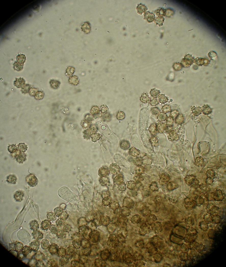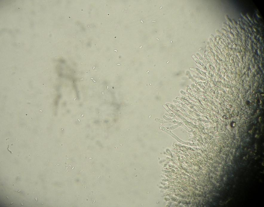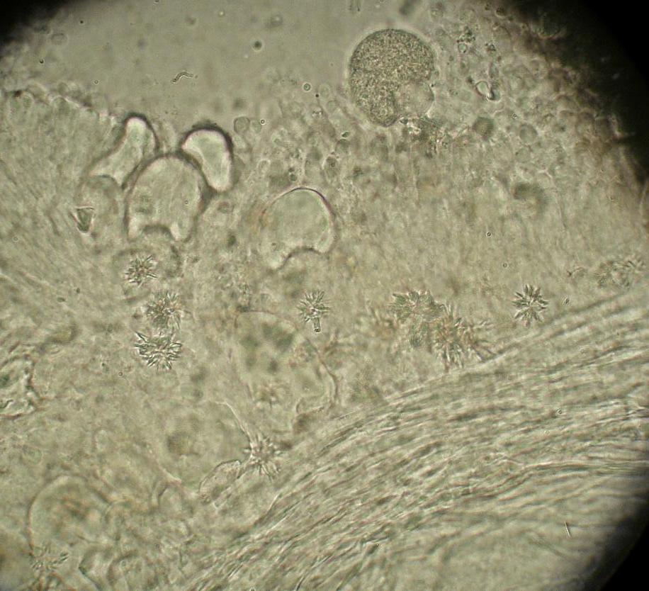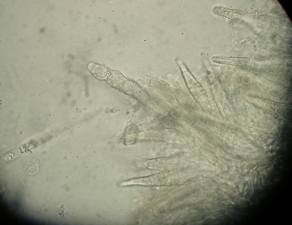 Ein zunächst ziemlich unauffälliger Nadelholzbewohner, der seine faszinierenden inneren Werte unter dem Mikroskop offenbart, und zwar zwei Arten von Zystiden. Die großen, klobigen Dinger sollen Halozystiden sein, die kleinen Sterne sind die Astrozystiden. Spock lässt grüßen.