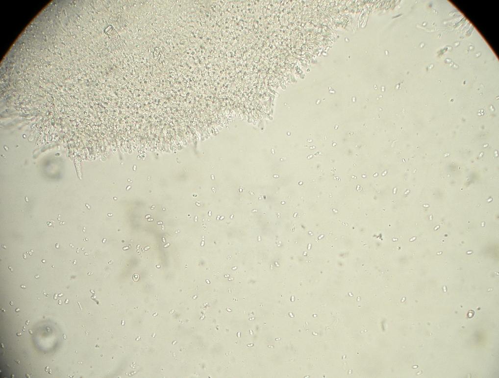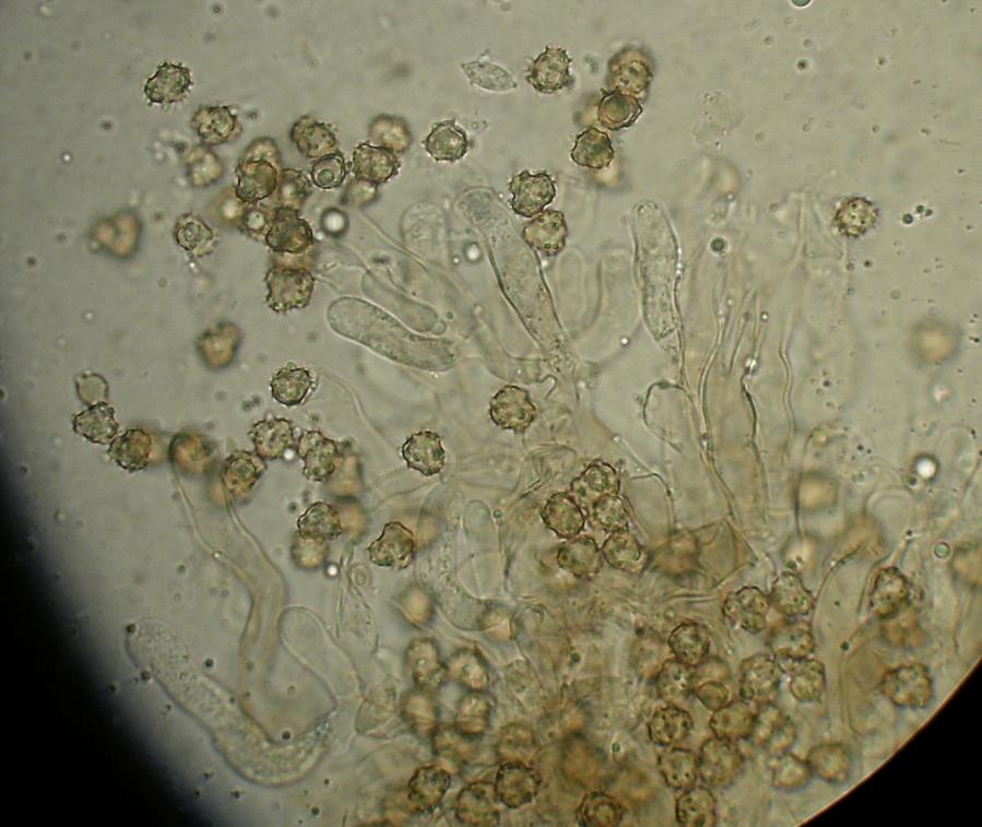 Unterm Mikroskop fallen auch hier lange Zystiden auf und ziemlich kleine, ellipsoide Sporen.