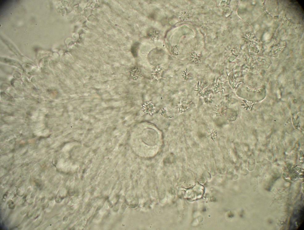 Das Makro ist <X . Kann damit zu tun haben, daß es Samstag abend war, Stefan und ich eine Zugfahrt im Kreuz hatten und es schon gar nicht mehr so hell war. Aber unter der Stereolupe und mikroskopisch ist dieser selten beachtete Pilz schon ein Hingucker mit seinen riesigen, kristallbeschopften Zystiden.