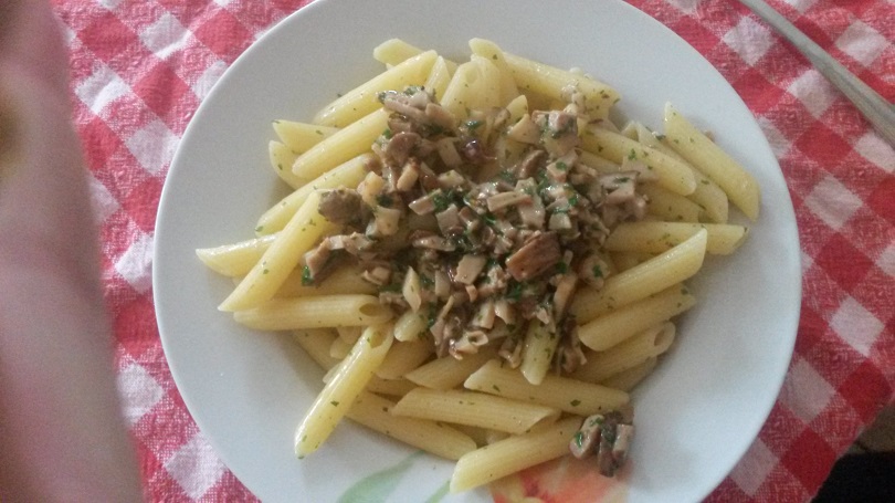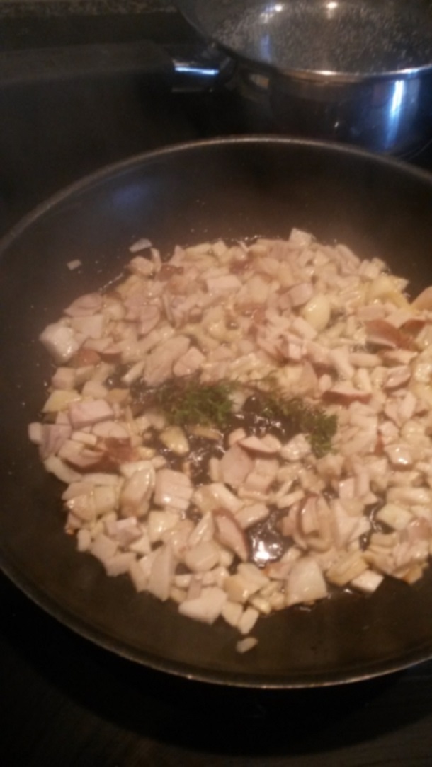 2x Wasser aufsetzen, Pfanne rausholen, Olivenöl, 1 Knofi leicht bräunen, die Pilze und ein Thymianzweig hinein, alles anbruzeln