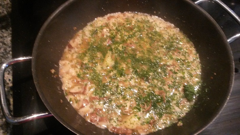 Thymian und Knofi raus, Salz + Pfeffer + ein Stückchen Peperoncini und etwas Wasser und ein Stückchen Butter hinein, kurz cremig werden lassen. Aus - Petersilie drauf