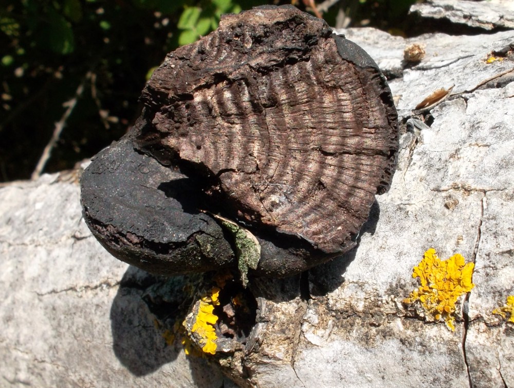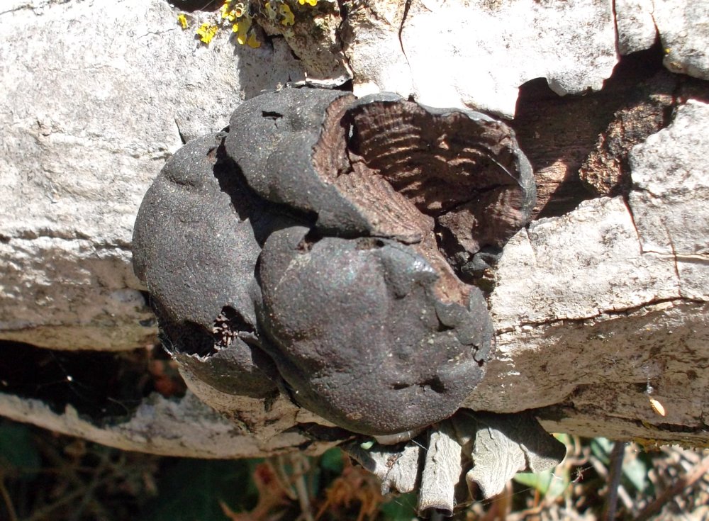 Beim Wandern auf Kreta auf unbestimmtes Totholz entdeckt. Äußerlich wie gigantische Kohlenbeeren (mehrere cm groß, siehe auch im Vergleich zu der Gelbflechte). Konnte leicht ein Stück herausbrechen ohne Werkzeug.