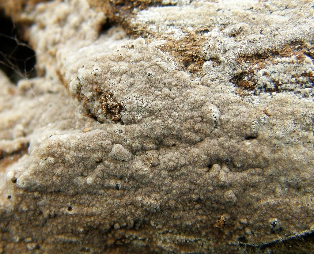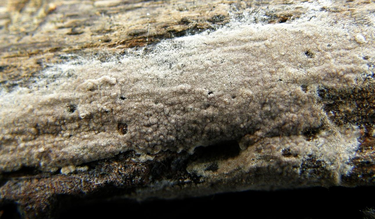 Die Oberfläche ist filzig und am ehesten warzig, weder bläulichen noch grünlichen Schimmer kann ich erkennen, ein Subikulum ist schon vorhanden, aber nicht überall ausgeprägt. Das wäre sehr dünn und weißlich, Rhizomorphen wenn ja, dann nur sehr fein.