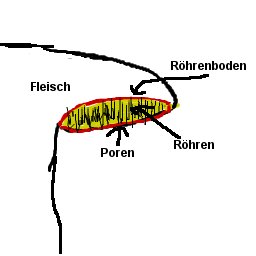 Die Kappe ist graubraun und halbrund etwas ähnlichkeit mit Rinde also nicht ganz glatt. Die Röhren sind dunkelrot bis weinrot und recht kurz bis max 1cm und sehr fein. Beim Bruch färbt sich das fleisch sofort in orange rot und wird später grau orange bis grau weiß. Das Fleisch und die Röhren sind recht fest.