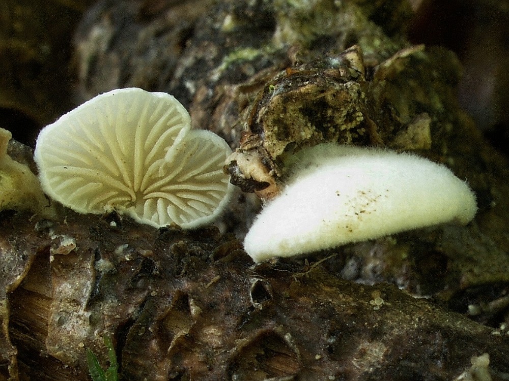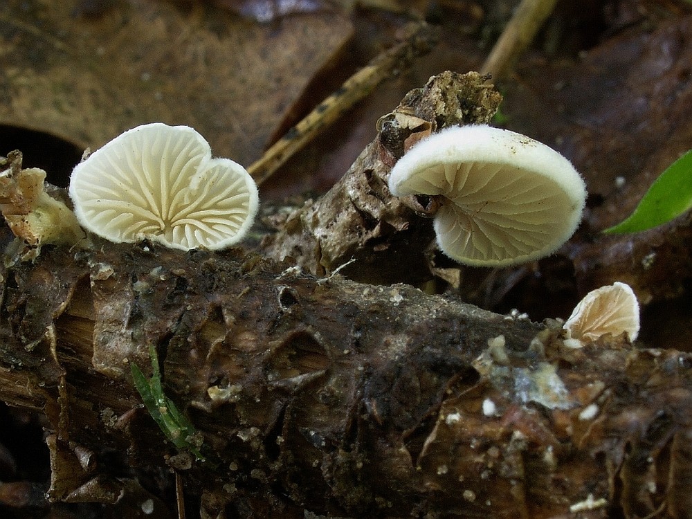 An einem Laubholzzweig wuchs das Entferntblättrige Stummelfüßchen; Crepidotus cesatii.