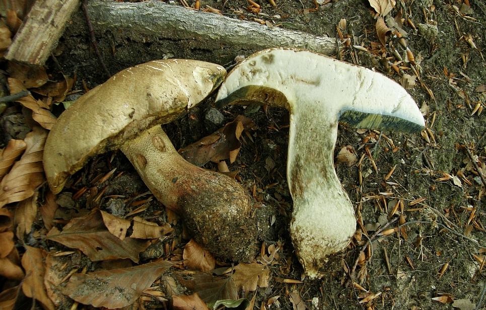 Fundort bei Fichte, ca.900m, Kalkalpen. Hut ungef. 15cm breit, hellbraun, etwas feldrig aufreißend, trocken. Röhren/Poren olivgelblich, auf Druck blauend. Fleisch im Hut und oberen Stielteil weiß, im Schnitt schwach blauend, nach einiger Zeit verblassend. Zur Stielbasis hin und an Fraßstellen weinrötlich. Stiel mit zartem Netz. Geruch angenehm, aber schwach ausgeprägt. Kein bitterer Geschmack auf der Zunge.