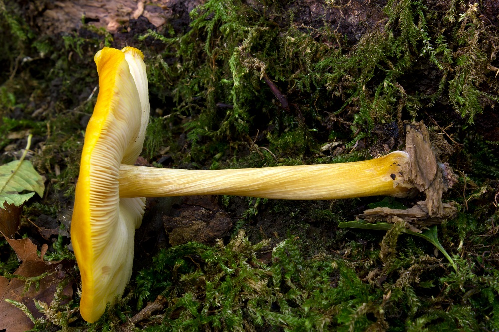 Stiel: 4-7 x 0,2-0.5cm zylindrisch, elastisch, alt hohl, jung weißlich bald gelb bis olivgelb werdend, längsriefig, im Alter weiß längs überfasert
