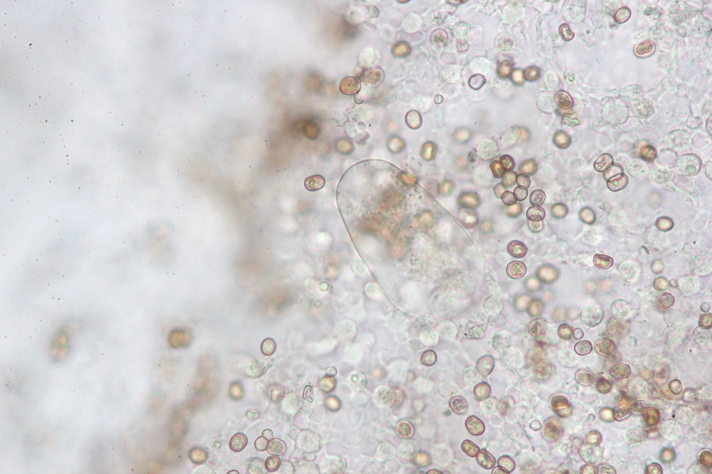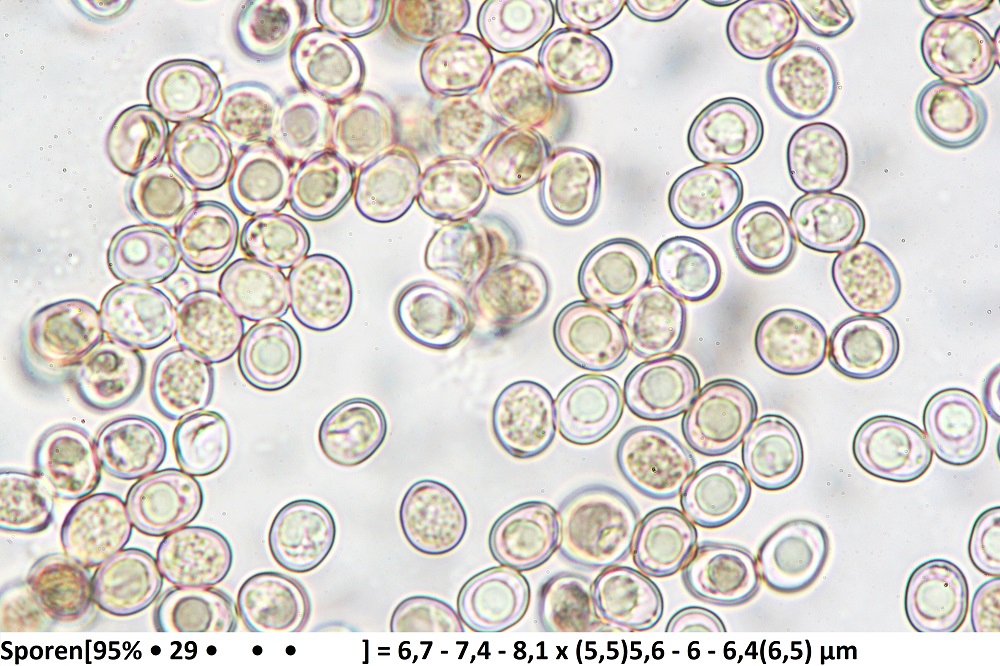Mikroskopische Merkmale: Sporengröße: 6-8 x 5-6,5 µm, Pleurocystiden vorhanden aber weisen keine apikalen Haken auf, Cheilocystiden flaschenförmig, Huthaut bestehend aus spindeligen Strukturen