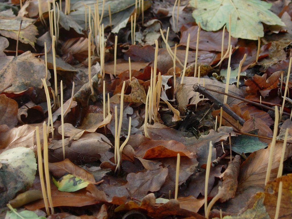Fruchtkörper: Dünne bis 8 CM langen Fruchtkörper oft etwas verbogen, elastisch und hohl, vom Boden aufsteigend, an der Basis etwas verkrümmt, hell Ocker gefärbt im Alter dunkler werdend.