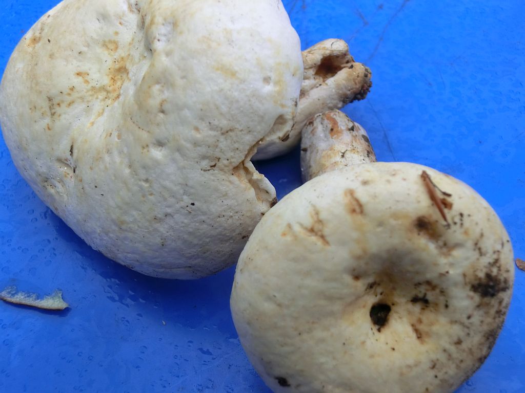 Du hast die auf dem rechten Exemplar vorhandenen bräunlichen Hutvelumflocken nicht richtig interpretiert. Das ist eindeutig Rugosoamanita crassipes, seit neuestem zur Gattung Imleria gestellt.