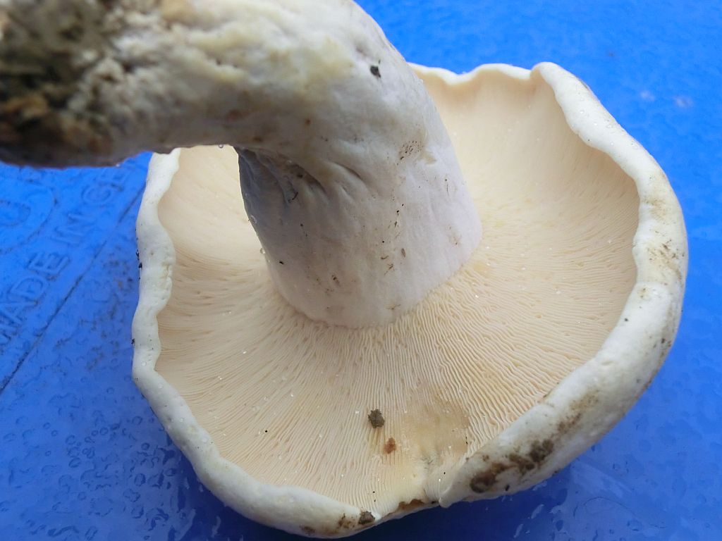 Nachdem sie nicht mehr so nass waren, sehen sie nicht mehr so weiß aus sondern haben bräunliche Flecken und sind eher cremefarben. Ebenso die Lamellen. Beim Anschnitt tritt eine weiße Milch aus (aber nur kurz). Diese ist einfach nur "sauscharf" und kratzend. Der Pilz riecht nach gar nichts. Die Enden vom Stiel sind gelblich. Liege ich richtig mit dem Pfeffermilchling?