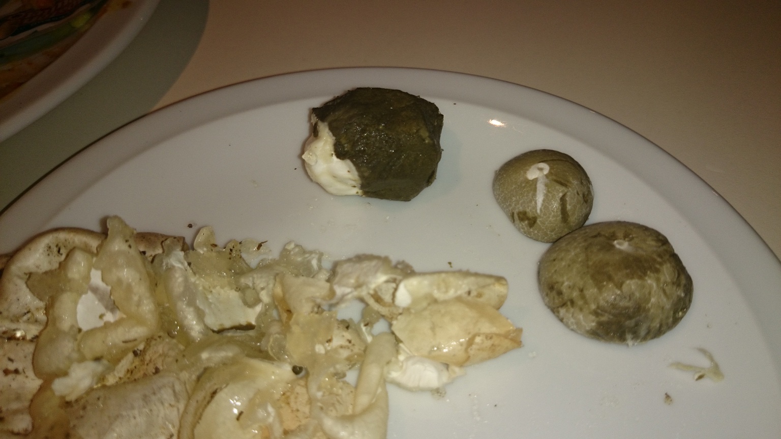 Wie habt ihr die Hexeneier denn zubereitet. Sieht auf dem Teller so aus, als hättet Ihr die komplett verwendet. Man entfernt die schleimige äußere Hülle und bereitet nur das Innere zu.