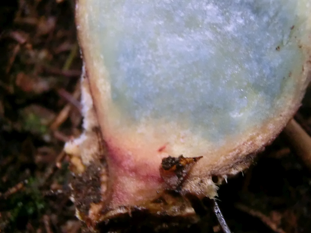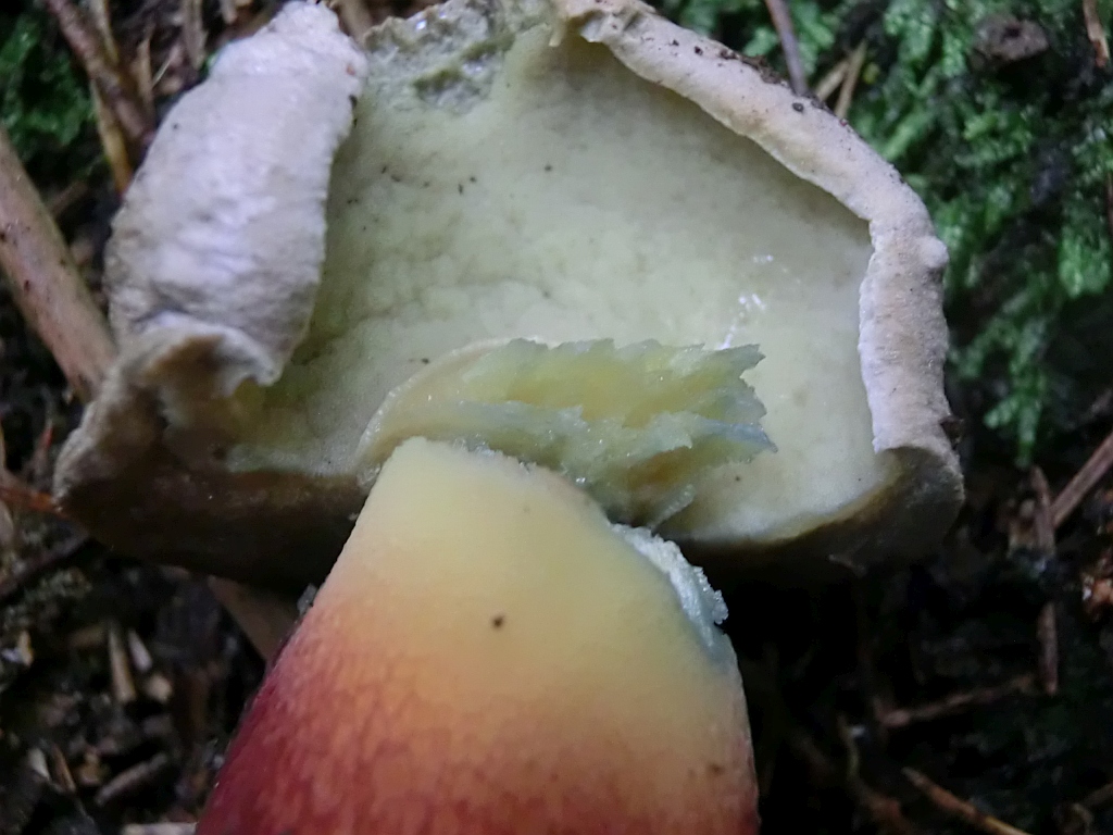 Ganz sicher! Nach dem fotografieren habe ich kontrolliert: Röhren hellgelb, auf Druck leicht ins bräunliche. Huthaut war schleimig, aber abziehbar. Der Stiel war ebenfalls leicht schleimig und nach dem Schnitt veränderte sich die Farbe ebenfalls leicht rosa/bräunlich. Geruch:??