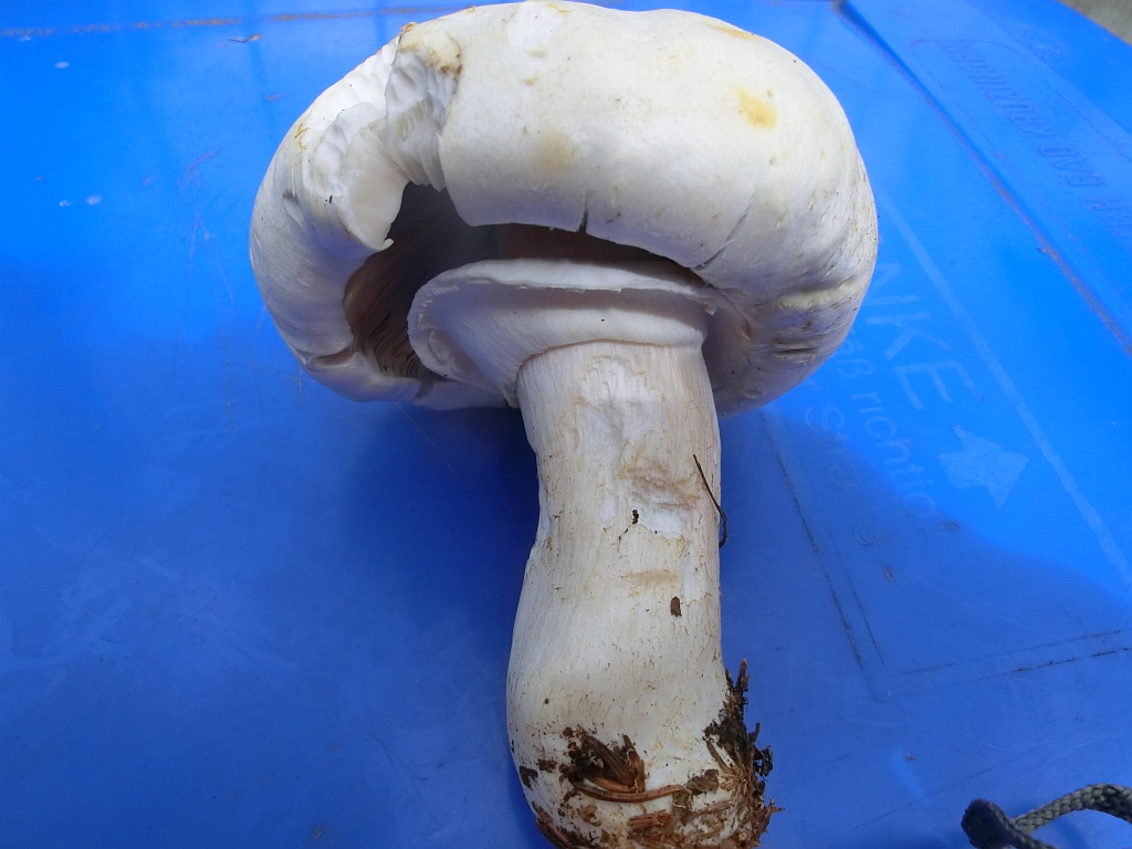 Diesen habe ich am Weg im Gras gefunden. Bekam, da wo ich ihn anfasste, gelbe Flecken. Geruch: nach Anis, Haut: trocken und glatt, Farbe: weiß, Lamellen: cremefarbig, ansonsten keine weiteren farblichen Veränderungen, ziemlich groß (etwas mehr als die Riesenchampis im Laden)