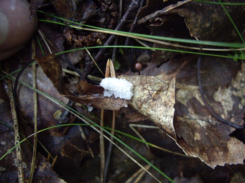 Sind das Schleimilze? Sahen aus wie Fischeierschleimpilze; allerdings in reinweiß. Der Durchmesser einer solchen Kugel betrug max. 1 mm.