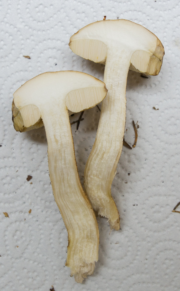 2. gefunden unter Fichten. Vielleicht ein alter, ausgeblasster Rettichhelmling? Riecht auf jeden Fall deutlich schärflich.