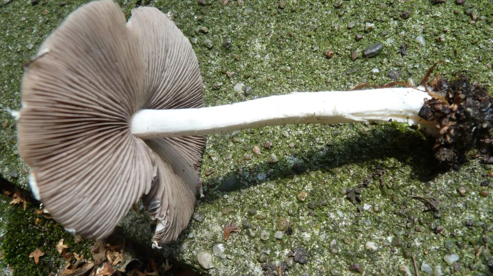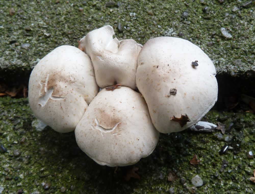Die Platten liegen da seit über 40 Jahren, keine Ahnung, was da drunter ist. Abgestorbene Efeu-Wurzeln möglicherweise und auch welche einer gefällten Birke. Ansonsten ist vielleicht 8m weg die alles dominierende haushohe Birke, die Nachbarschaft sind entsprechend zwei verschiedene Täublinge, Birkenpilze, Kahle Kremplinge, Rotfußröhrlinge und eine Handvoll irgendwelche rundum beigen Ritterlinge.