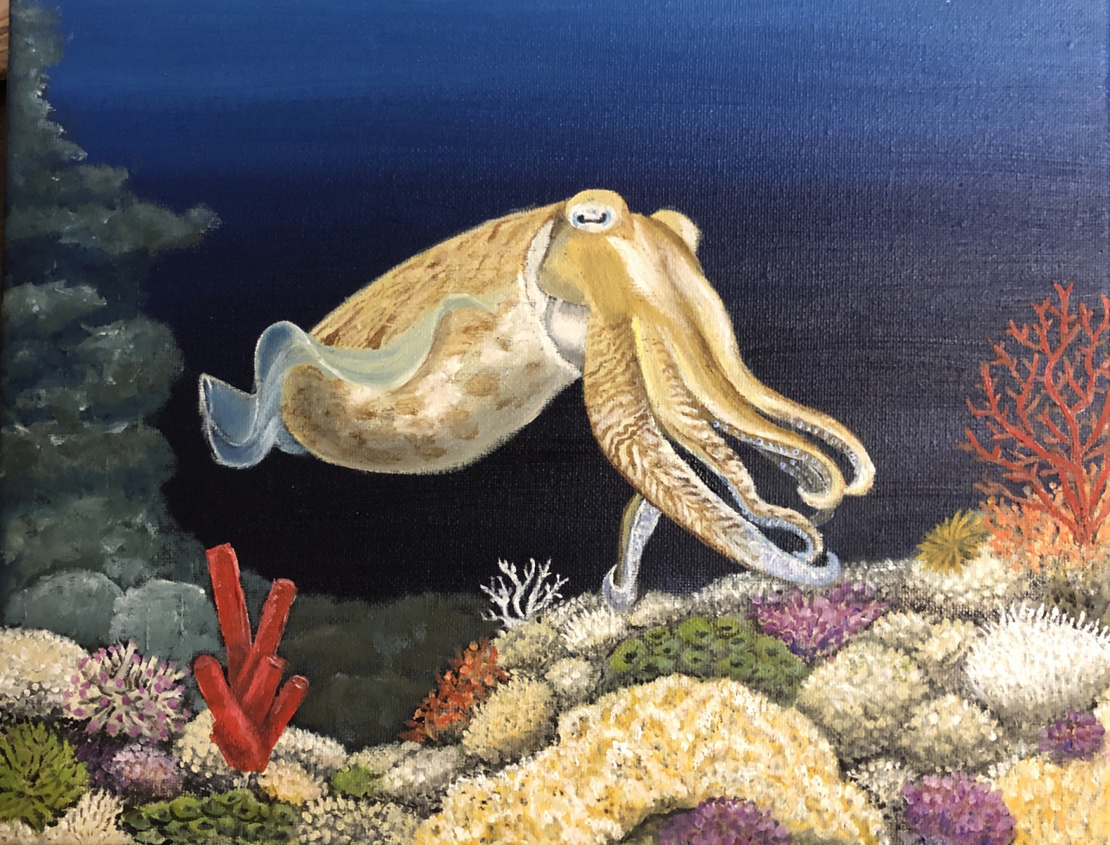 Ich hab nur noch eine kleine Anmerkung zum Sepiabraunen. Den hatte ich sofort, weil ich zufällig gerade jetzt an einer Gruppe Unterwasserbilder male. Darunter eine Sepia. Das sind ganz bezaubernde Geschöpfe, die sind neugierig, verfolgen Dich mit angemessenem Abstand unter Wasser und interagieren.