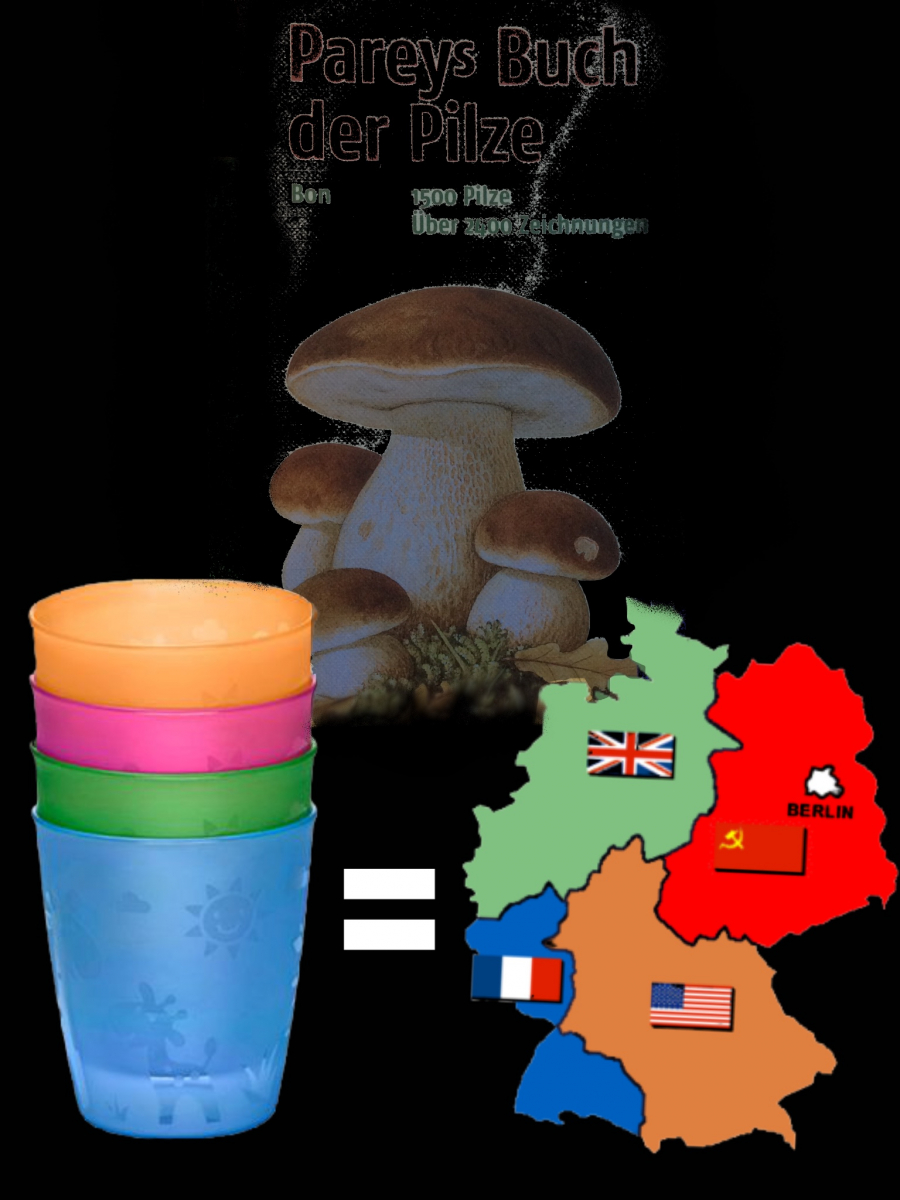 Das Jokerbild war nur noch auf die Art bezogen, denn die Gattung "Duftstacheling" hatten die meisten schon. Es zeigte im Hintergrund den "Parey's", in dem der Pilz unter diesem Namen steht, und im Vordergrund Becher für "becherförmig" und das in Besatzungszonen eingeteilte Deutschland für "gezont"; will sagen: "Im Parey's heißt der Becherförmige Duftstacheling Gezonter Duftstacheling".