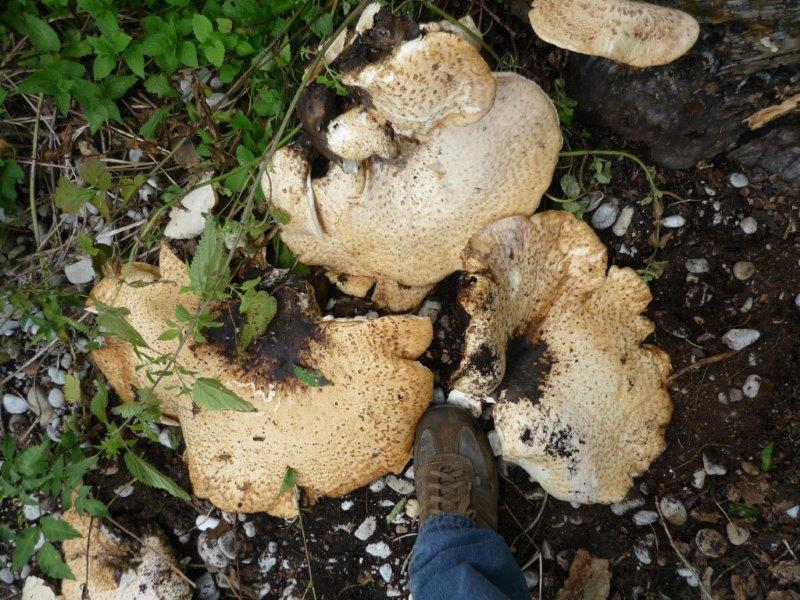 Ich finde immer wieder mal diese riesigen Brocken unter den Wirtsbäumen liegend, auch in Auwäldern an Stellen, wo außer mir (so viele Morchelsucher scheint's hier nicht zu geben) niemand hinkommt. Wenn die Fruchtkörper im Alter ihren Dienst erledigt haben, werden sie bröckelig und irgendwann halten sie nicht mehr am Substrat.Denn wie Andreas schon schreibt: Die aus Rücksicht auf den befallen Baum abzumachen, wäre ja ein denkbar sinnfreies Unterfangen. Aber es ibt eben Leute, die keine Ahnung haben.
