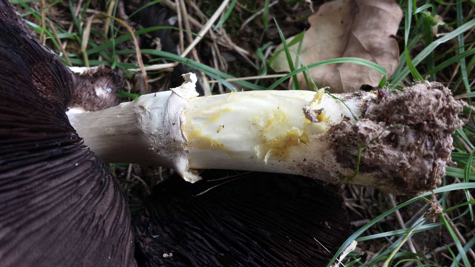 Wenn man am Pilz herumkratzt faerbt sich die Stelle am Pilz auch nach Minuten nicht gelb. Nur die abgekratzten Pilzteile. Die jedoch deutlich.
