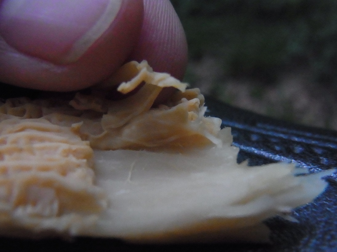 und zweitens: die pfifferlinge, ich war noch mal dort, und hab einen alten gefunden, auf dem bild sieht man, wie ich die "lamellen"??? ablöse...
