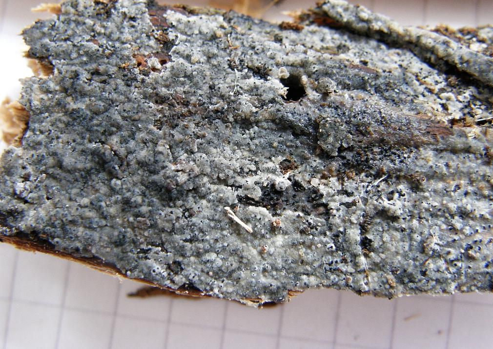 Am Sonntag lenkte ein Büschel Bluthelmlinge die Aufmerksamkeit auf folgenden Rindenpilz: