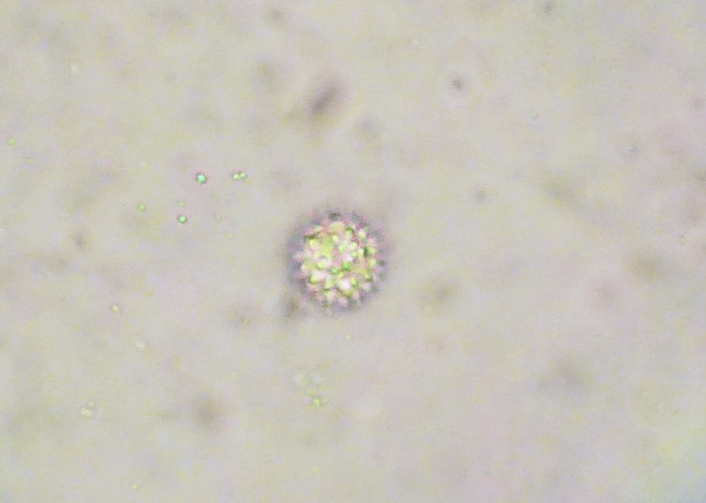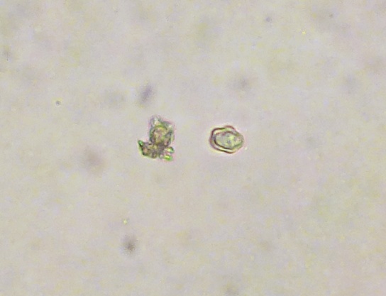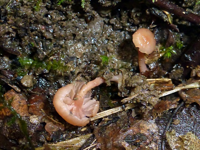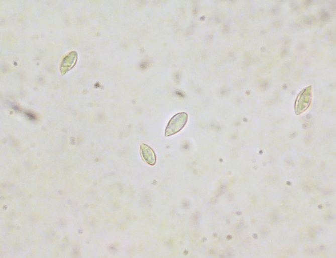 Hat mich besonders gefreut, da lange gesucht. Der Zwerg (ca. 1,5 cm hoch) hat die größten Sporen aller Lacktrichterlinge (hier 10-12 µm)