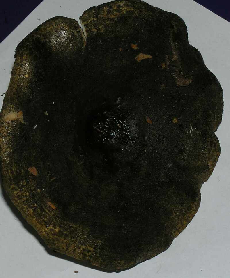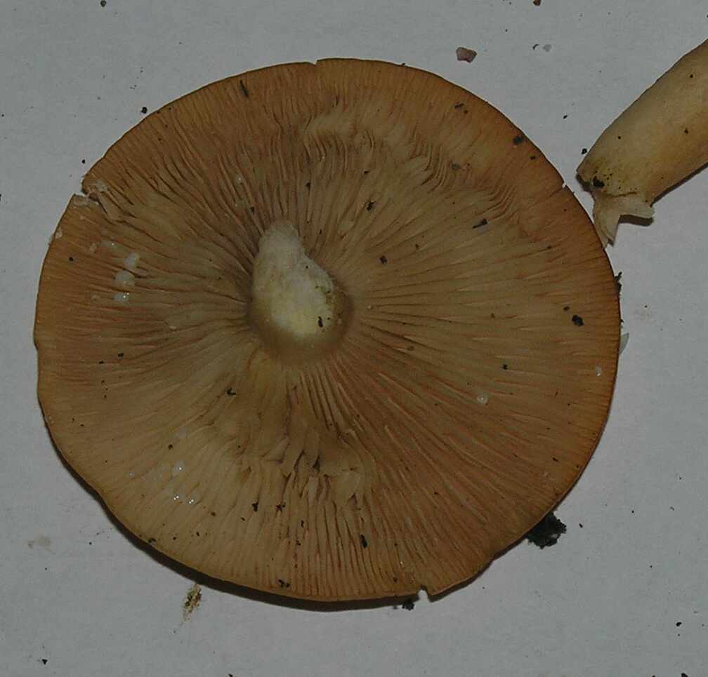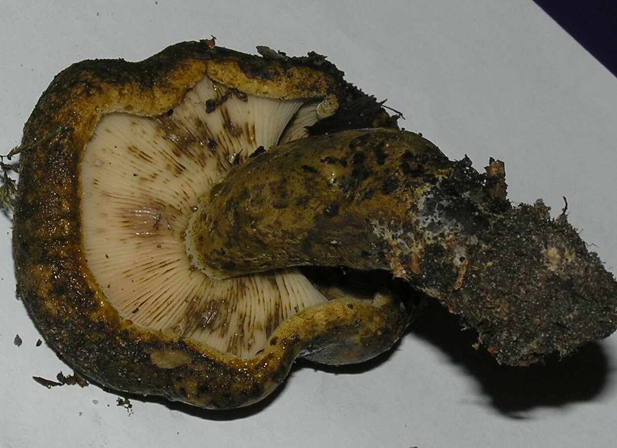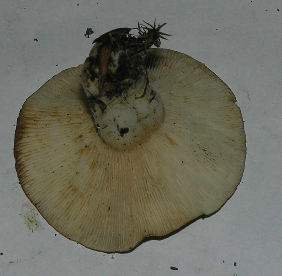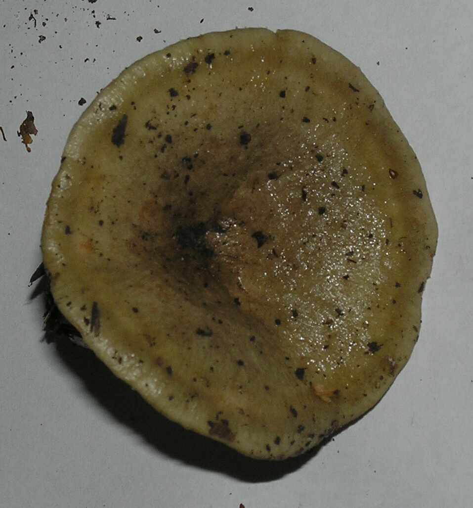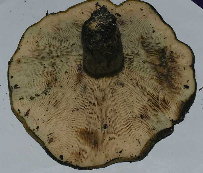 Pilz Nr. 3 (Bild 6-7):Blassrandiger Milchling (Lactarius fluens)? Der Pilz sonderte reichlich weiße, sehr scharfe Milch ab. Die Lamellen wiesen braune Flecken auf. Er wuchs ebenfalls unter Buchen (in der Nähe standen Spechttintlinge (Kalkanzeiger?)). Die Milch färbte sich auch auf weißem Papier nicht. Der Hut war schmierig. Liege ich hier richtig oder handelt es sich doch um den Graugrünen Milchling oder gar um einen ganz anderen?