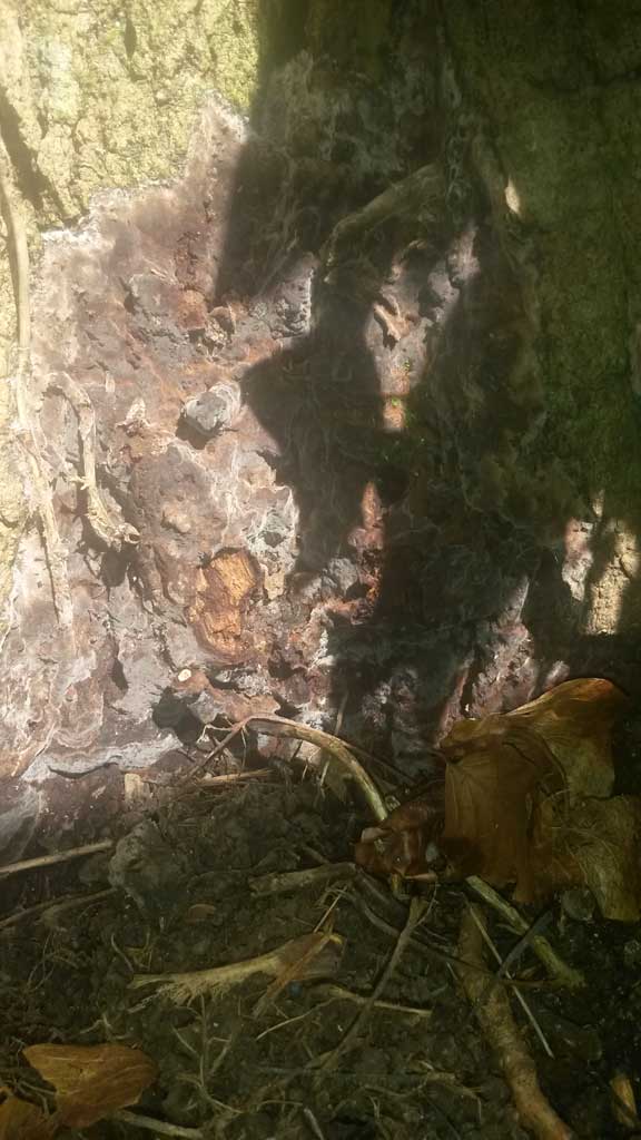 im Rahmen meiner Baumkontrolle stellte ich am 25.7 flächige Beläge im äusseren Stammfußbereich fest.