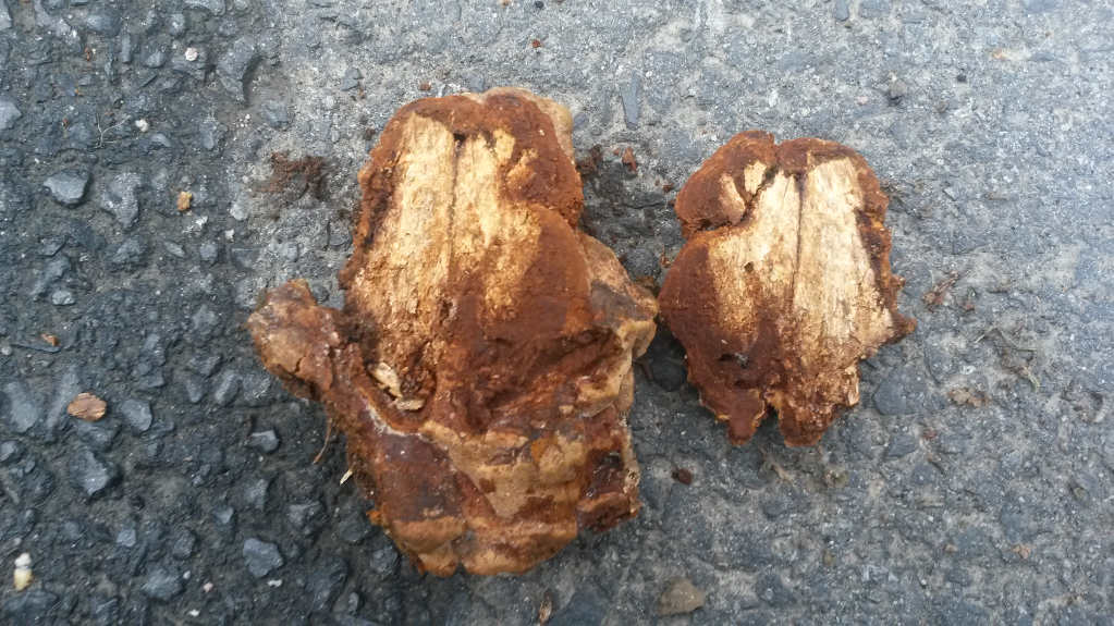 Aber das Schnittbild schaut mir eher nach Inonotus aus (die beiden anderen sind hellfleischig), da käme ich dann in Kombination mit dem ersten Bild auf Inonotus nodulosus.