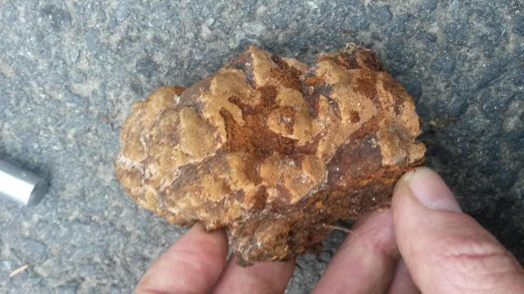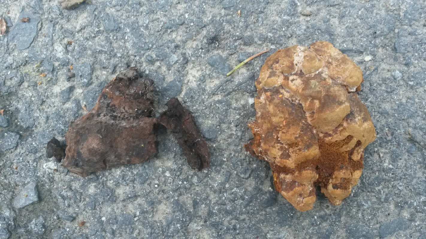 Auf der anderen Seite: Hart,rötlichbraun mit teilw. dunkler Hutkante/undeutlicher Fruchtkörperausbildung.