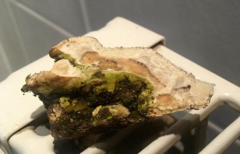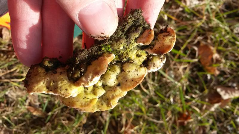 An den Rändern zeigt der Pilz weissliche Zuwachs, aber keine erkennbaren Hutkanten..