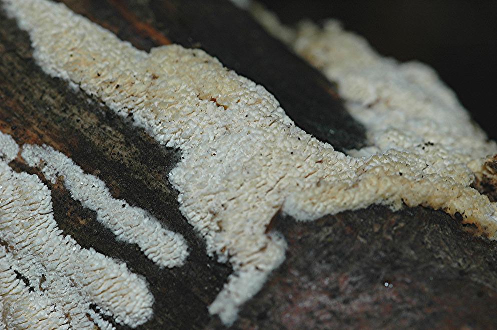 So weiße resupinat wachsende Pilze mit Zähnchen oder zerschlitzten Poren gibt ´s ziemlich viele.