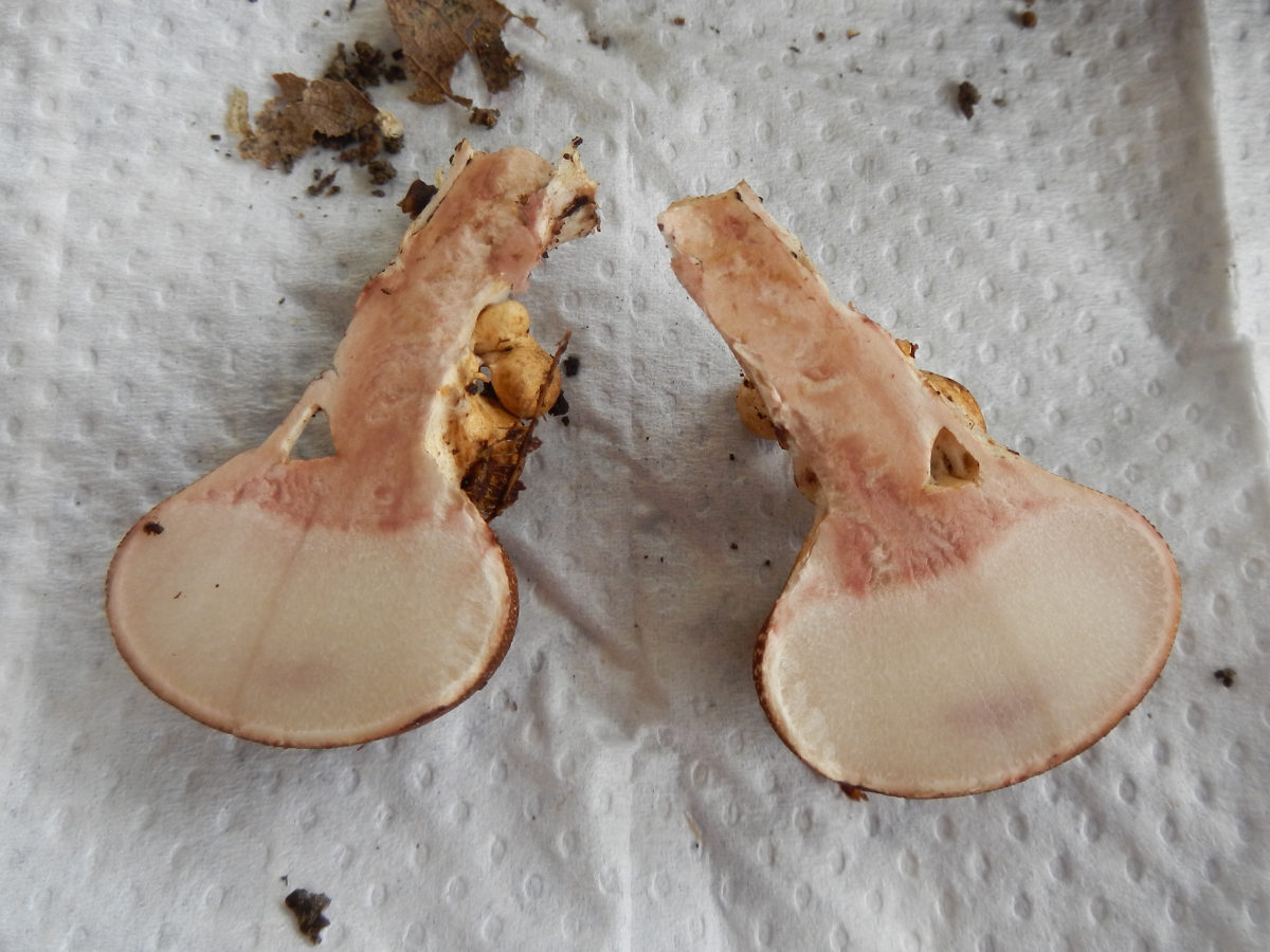 Der Fruchtkörper ist sehr fest, im Schnitt weißlich, färbt sich aber nach Anschnitt am Stiel sofort rosa- bis fleischfarben (Foto 3).