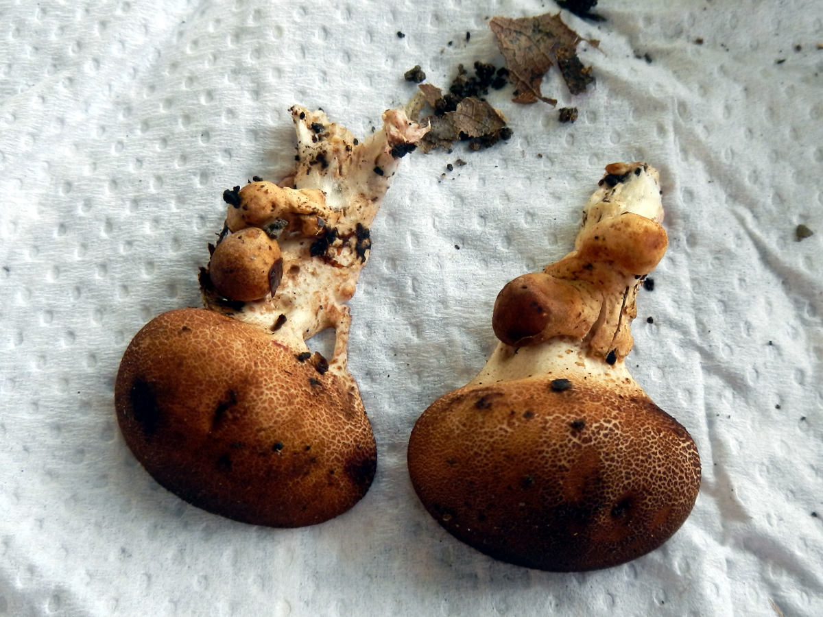 Nimmt man die Blätter samt Pilz hoch scheint das Mycel nicht in den Boden gewachsen zu sein sondern nur um und durch das Laub.