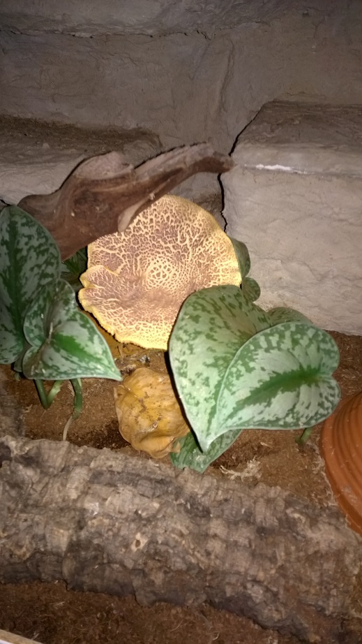 "Klima-Angaben": Terrarium ist eigentlich relativ trocken, bis auf den Ort wo der Pilz gewachsen ist, da dort eine Pflanze ist, der ich regelmässig Wasser gebe. Temperaturen sind so zwischen 30 - 23 Grad Tags über, da wo der Pilz gewachsen ist, dürfte es so 25 Grad sein.