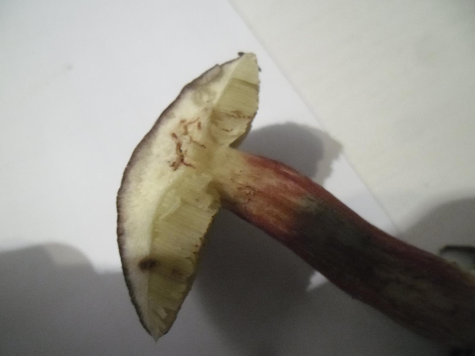 Bei dem Rotfußröhrling braucht es ein komplettes Schnittbild vom Scheitel bis zum untersten Ende der Stielbasis. Das ist bei Bestimmungen von Filzröhrlingen unverzichtbar.