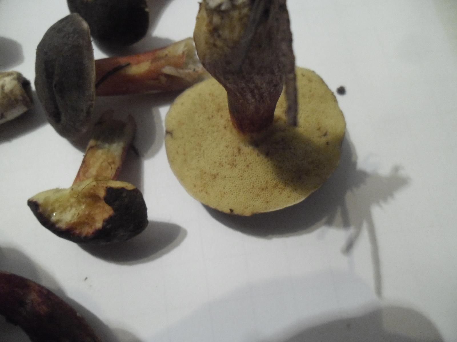 Dann habe ich viele von diesen hier gefunden. Kappen sind tief braun, und sammtig. Röhren sind zitronengelb, Fleisch ist blass gelb bis weis. Der Stiel ist rot und am Hutansatz gelb. Er Bläut nicht, riecht Pilzig.