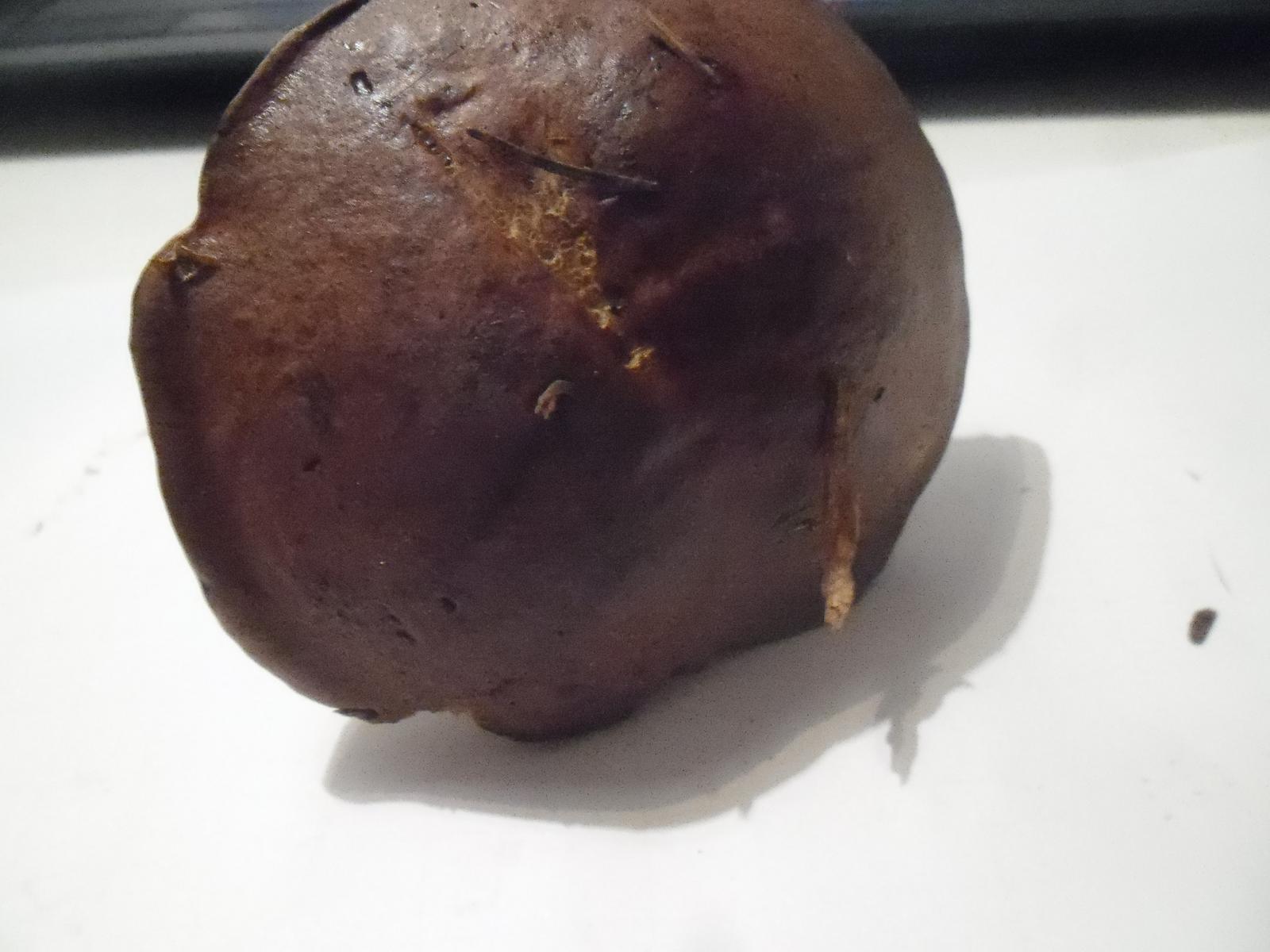 Einen einzigen von dieser Sorte habe ich gefunden. Lederbrauner Hut, Blassgelbe Röhren, Braun benetzter Stiel, innen Heller, Die Röhren bläuen langsam bei Druck und nach dem aufbrechen. Das Fleisch ist grau. Er riecht auch Pilzig.